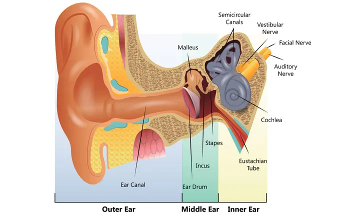 The ear has an outer, middle and inner part, and a hearing nerve connecting the inner ear to the brain.