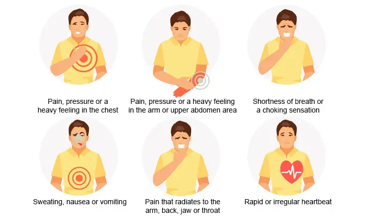 Nyeri, tekanan atau rasa berat di daerah dada, lengan atau perut bagian atas