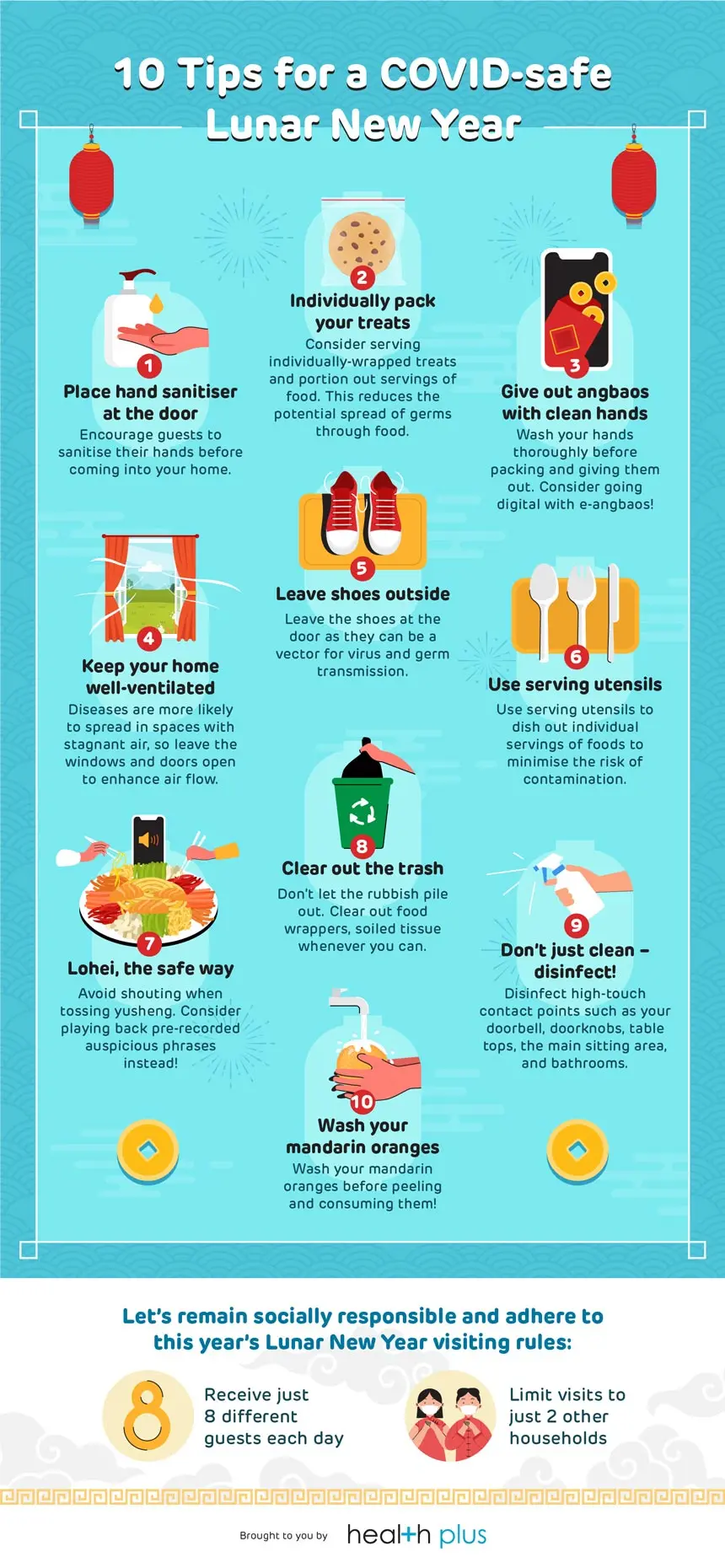 Meskipun demikian, kami juga menyadari bahwa beberapa tips ini mungkin mengharuskan kita untuk menyesuaikan kebiasaan yang biasa kita lakukan, seperti berbagi makanan, tidak "mengusir keberuntungan dari rumah", dan banyak lagi. Namun, dengan ancaman COVID-19 yang membayangi, mari kita lebih berhati-hati - sambil tetap menjaga suasana meriah, tentunya. Selamat Tahun Baru Imlek!